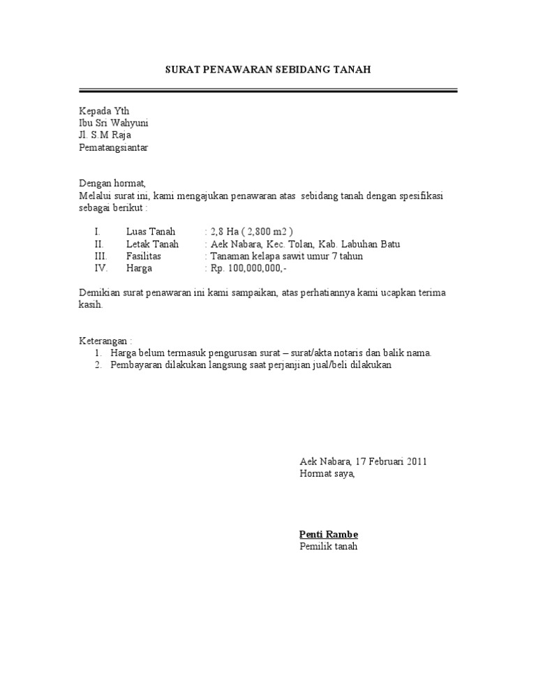 Contoh surat penawaran harga tanah. Contoh perjanjian dengan investor, 3. Di bawah ini akan disajikan beberapa contoh surat penawaran dalam. Biasanya surat penawaran ini dibuat oleh para pebisnis atau pengusaha dalam segi ekonomi yang isinya berupa negosiasi tentang pembelian dan penjualan produk atau jasa dengan mencantumkan harga yang ditawarkan. Savesave contoh surat penawaran harga tanah for later. Perkenankanlah terlebih dahulu kami ucapkan terima kasih atas kesempatan yang diberikan kepada kami untuk menawarkan penjualan tanah milik kami kepada pt. Dalam dunia bisnis, penawaran akan selalu ada antara pihak satu dengan pihak lainnya. Surat penawaran berisi mengenai detail produk dan harga yang ditawarkan kepada calon konsumen. Disamping memiliki pengaruh yang baik untuk membuat jenis usaha kita dapat laris dan laku dipasaran. Contoh surat penawaran barang download surat penawaran barang maupun membuat surat penawaran dan template surat penawaran terbaru. Dengan luas tersebut, lokasi ini sangat cocok rencana pembangunan kompleks perkantoran baru yang surat penawaran kerja sama dapat bermanfaat untuk menjalin kemitraan baru dan meningkatkan penjualan di saat. Karena pada artikel ini akan membahas sekaligus memberi contoh tentang bagaimana cara menulis surat penawaran dengan baik dan benar. Tak memandang usia, banyak dari mereka yang masih berusia remaja bahkan yang sudah tua juga menggeluti profesi.