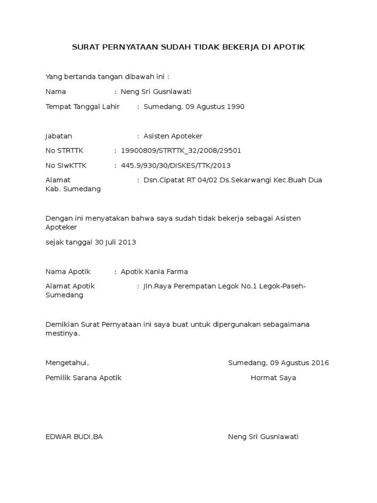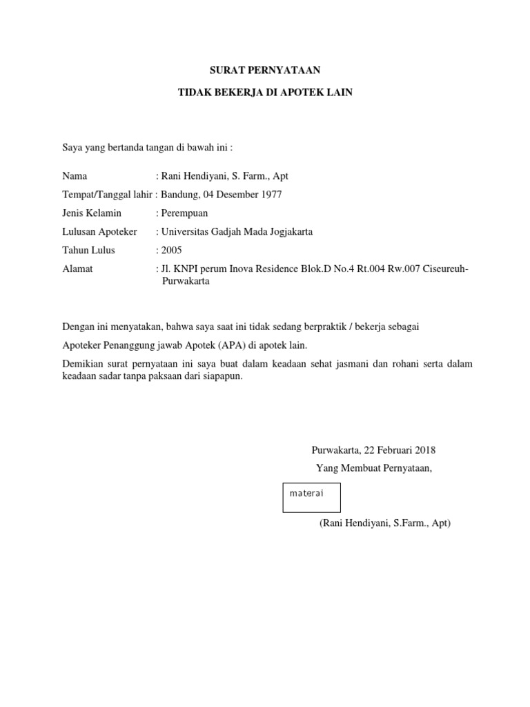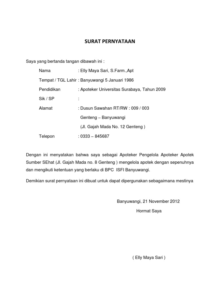 Contoh surat pernyataan ceraijuga dibutuhkan untuk mengetahui cara membuat surat pernyataan. Kepada yth scan surat pernyataan dari pihak pelamar dengan materai rp6000. Surat pernyataan kesanggupan harus mencatumkan sebuah pernyataan secara jelas akan kesanggupan untuk melakasanakan tugas yang akan diberikan serta mau menanggung resiko apapun baik berupa hukuman atau hal lainnya jika terbukti bersalah atau gagal dalam menjalankan tugas. Apoteker pemohon membuat surat pernyataan siap melakukan kegiatan. Contoh surat pengalaman kerja di apotek. Posisi ini pun sesuai dengan latar belakang pendidikan akhir saya yaitu s1 farmasi. Akta notaris perjanjian kerjasama apa dan pemilik sarana apotek (psa). Surat semacam ini dibuat secara tertulis dan begitu penting. Demikian surat lamaran pekerjaan yang saya buat. Berikut kumpulan contoh surat pernyataan diri, kerja, kesanggupan, utang, sekolah, belum menikah, ahli waris, orang tua, kehilangan, jual beli tanah dan misalnya, surat pernyataan yang berisi tentang pernyataan siswa untuk tidak mengulangi perbuatan buruknya di sekolah atau kesediaan para siswa. Apotek makmur 1 merupakan tempat yang sangat baik untuk dilakukannya perkerjaan kerfarmasian dan pelayanan obat pada masyarakat karena peserta pkl. Sebagian orang mungkin pernah membuat atau menandatangani surat pernyataan. Silakan baca dan pelajari pola dan materinya dengan seksama.
