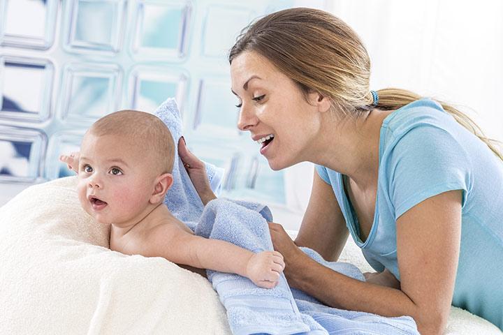 Lotion, which is a wonderful way to keep baby's skin moisturized for 24 hours. Undress your baby and wrap him or her in a towel. Slowly ease your baby into the tub feet first. Gently cleanse eyes with a dampened, warm cotton ball, wiping from the inside corner of the eye outward. You should use one hand to support the baby's head and neck.